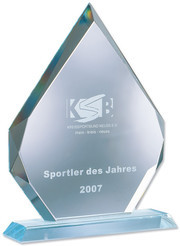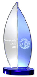 Trophy aus Kristallglas (3-D-Ansicht!) mit hochwertigem Diamantschliff, kostenloser Gravur Ihres Vereins- oder Firmenlogos und Ihres Wunschtextes sowie edlem Geschenketui.